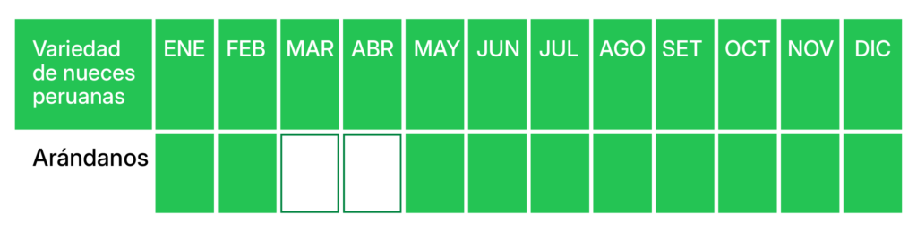 Perú cuenta con una de las temporadas más amplias del mundo para la producción de arándanos, con disponibilidad principalmente desde Mayo a Febrero, lo que permite abastecer a los mercados internacionales en periodos de alta demanda.